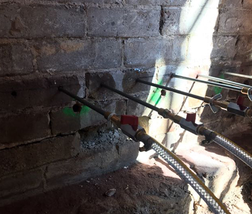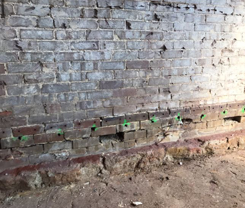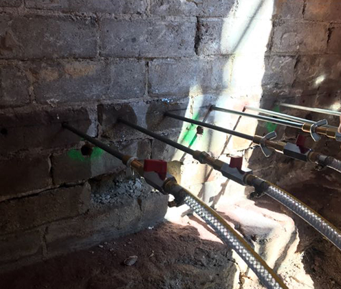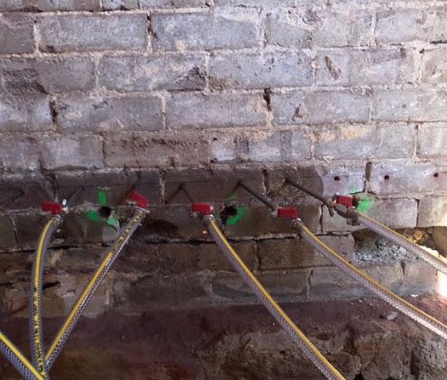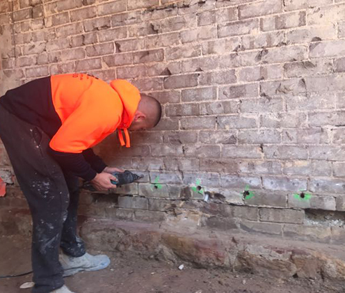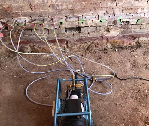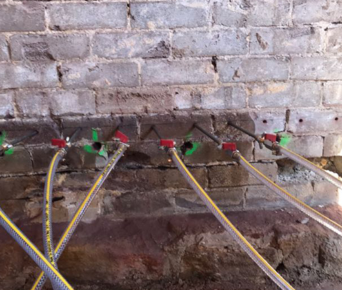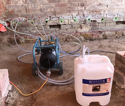 The system involves drilling a couple of 10-20mm holes into each brick. Then under pressure and through a set of lances we inject the Westox fluid into the bricks at approximately 150psi which saturates the bricks. A new damp course barrier has been created providing years of future damp proofing.